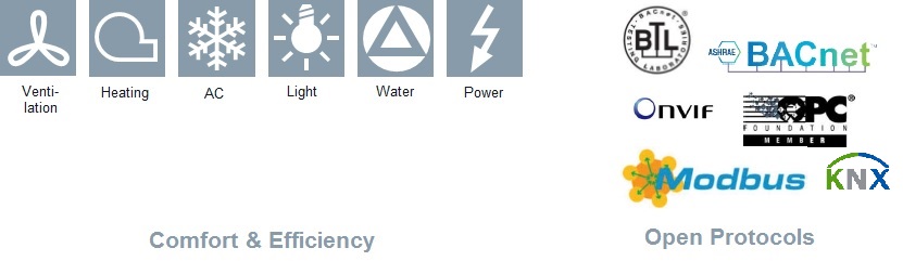 Integrated Control Systems offer turnkey solutions for the control of buildings including Building Management Systems, HVAC controls, Lighting control, Electrical Services monitoring (power meters, Generators, UPS, Lifts), Wet Services monitoring and other 3rd party systems via open system integration (BACnet, Modbus, LONworks, M-Bus, KnX, OPC etc). See the following link for an detailed explanation on the various open protocols found in building automation.(Link)